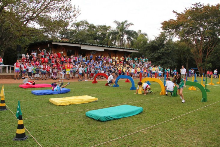 São dadas várias largadas. As crianças correm pelas quatro raias coloridas de suas equipes, andando em ziguezague, saltando cavalete, passando sob arco, andando sobre o travessão e dando cambalhota. Na linha de chegada, cada participante levanta sua bandeira. Vence a equipe que tiver melhor desempenho geral.