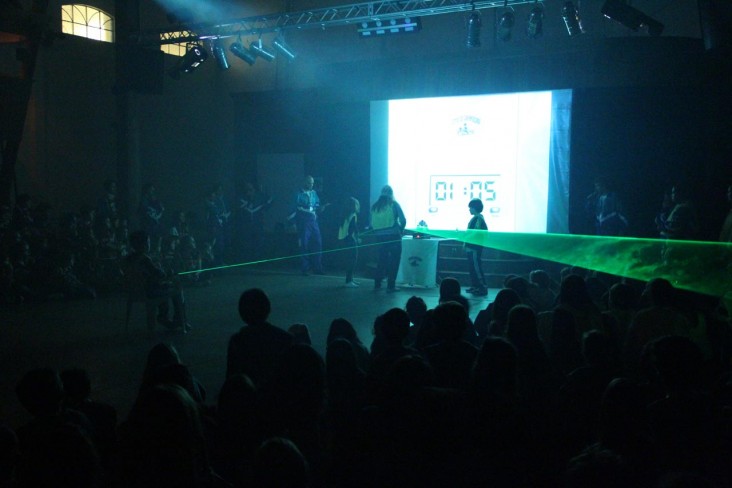 Cronômetro preparado no telão, iluminação baixa, efeito de fumaça no ambiente e cinco integrantes de cada equipe.