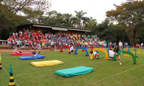 São dadas várias largadas. As crianças correm pelas quatro raias coloridas de suas equipes, andando em zigue-zague, saltando cavalete, passando sob arco, andando sobre o travessão e dando cambalhota. Na linha de chegada, cada participante levanta sua bandeira. Vence a equipe que tiver melhor desempenho geral.